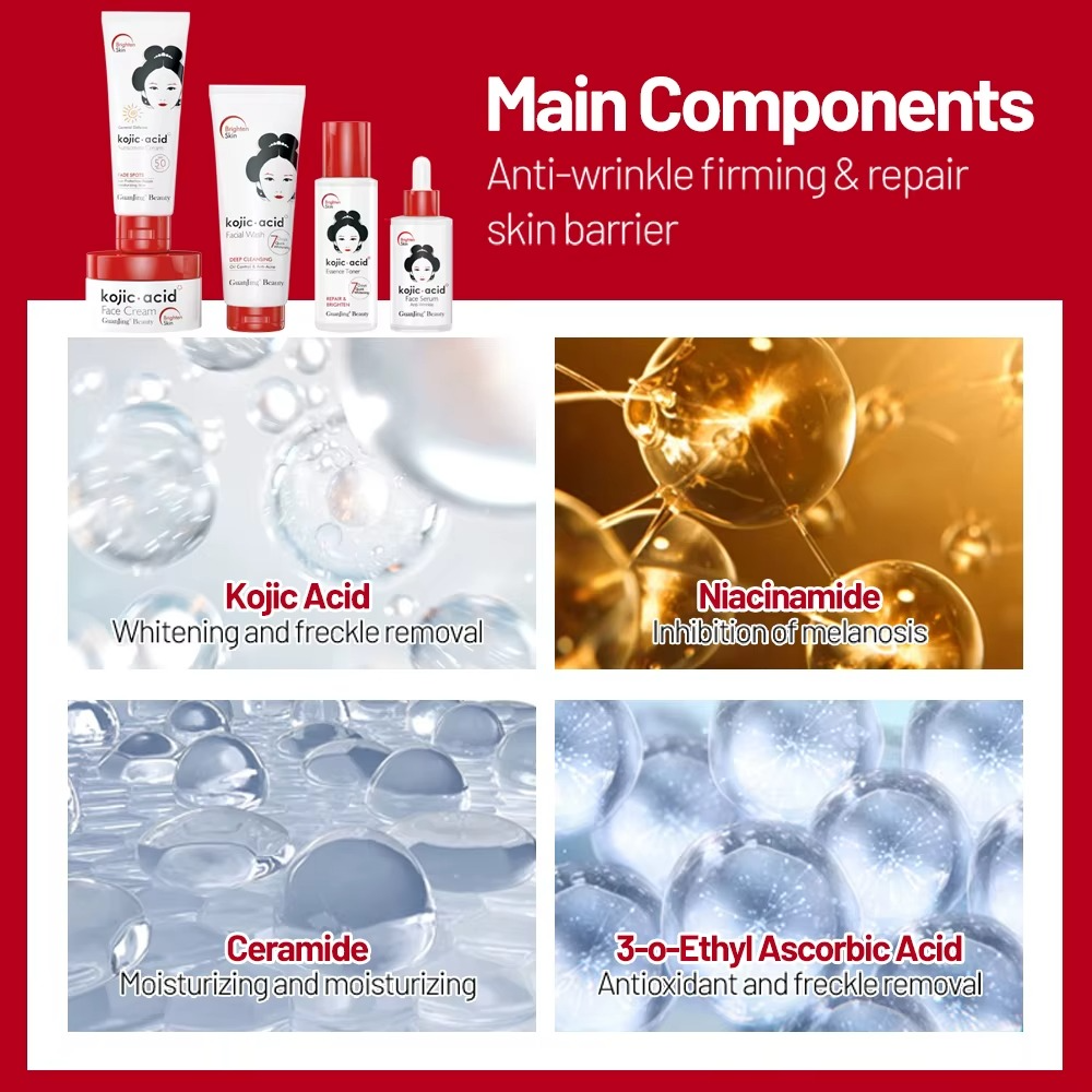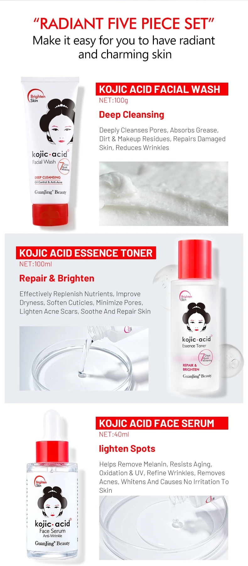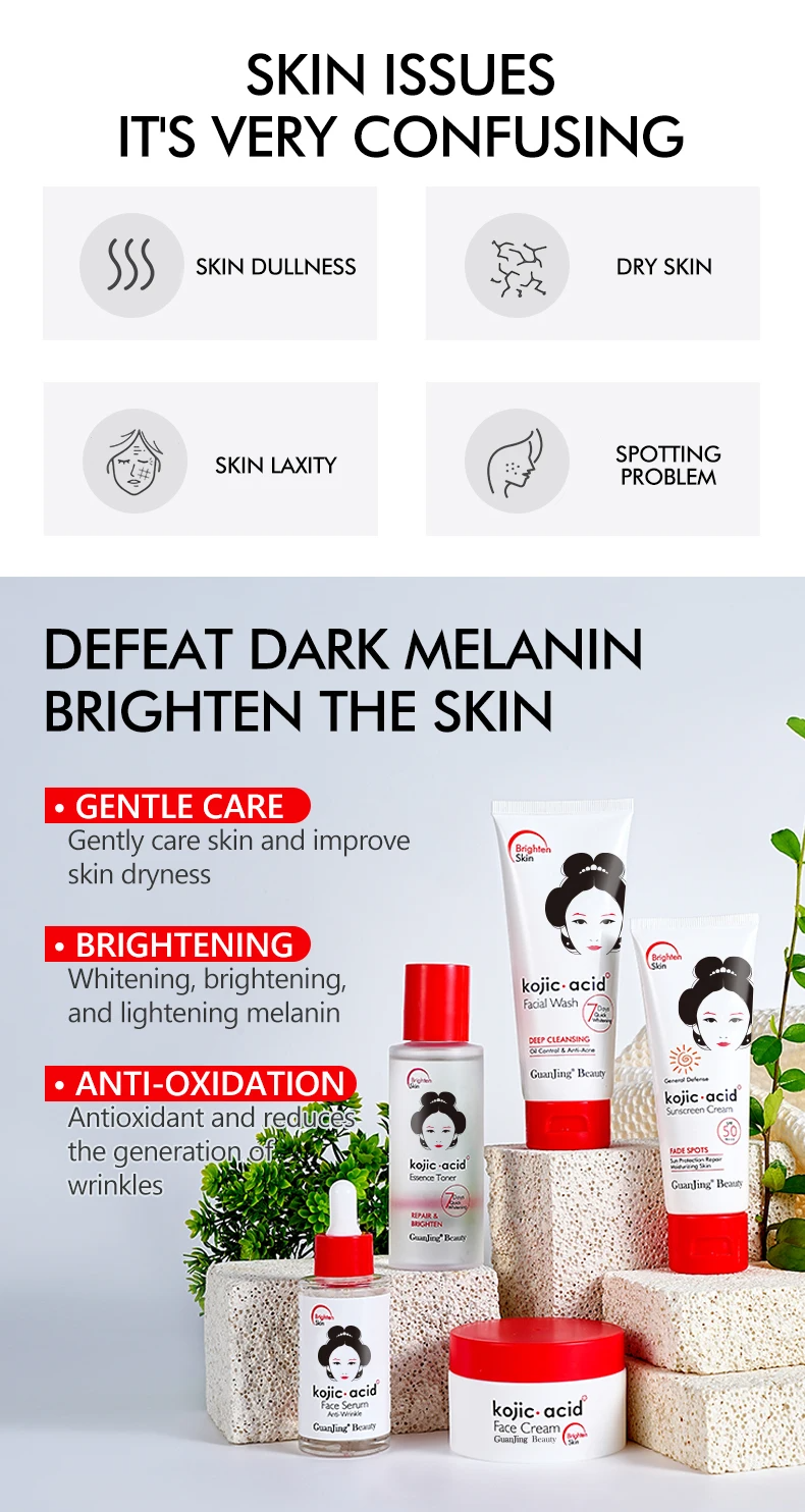🌸✨ مجموعة حمض الكوجيك الكورية – لبشرة أفتح، أنعم، وأصغر في العمر! من Guanjing Beauty – 5 قطع للعناية المتكاملة ببشرتج 💖 لو تبين بشرة صافية، موحّدة اللون، ومشرقة طبيعيًا؟ هالمجموعة هي الحل الكامل لج! تحتوي على خمس منتجات تشتغل بتناغم لتفتيح البشرة، تخفيف التصبغات، وترطيبها بشكل مثالي. وكل منتج في المجموعة له دور محدد ومهم. غسول الوجه - Face Wash (100g) يغسل البشرة بعمق، ويشيل الشوائب وبقايا المكياج والزيوت، بدون ما ينشف الوجه. 🌿 يمهد البشرة لاستقبال باقي المنتجات ويساعد على تقشير خفيف للبشرة الميتة. 2️⃣ تونر - Toner (100ml) يرجع توازن الـpH الطبيعي للبشرة، ويهدّيها بعد الغسول. 💧 يرطب، ويجهّز الوجه لاستقبال السيروم والمرطب بطريقة فعالة. 3️⃣ سيروم التفتيح - Serum (40ml) أقوى منتج في المجموعة! يحتوي على تركيز عالي من حمض الكوجيك لاستهداف البقع الداكنة والتصبغات. 🌟 يساعد على توحيد اللون مع الاستخدام المنتظم ويخلي بشرتج تلمع نضارة. 4️⃣ كريم الوجه - Face Cream (50g) كريم ناعم وخفيف على البشرة، يرطب بعمق ويغذيها، وفي نفس الوقت يعزز مفعول السيروم للتفتيح. 🌸 يترك البشرة ناعمة، ويفتحها تدريجياً بأمان وبدون تهيّج. 5️⃣ كريم واقي الشمس - Sunscreen (80g) يحمي البشرة من أشعة الشمس اللي تسبب تصبغات وبقع. ☀️ أساسي في الروتين اليومي لأنه يمنع عودة البقع ويثبت نتيجة التفتيح. ________________________________________ 🌟 المميزات العامة للمجموعة: ✅ تحتوي على حمض الكوجيك الفعّال لتفتيح البشرة ✅ تقلل من البقع الداكنة والتصبغات وآثار حب الشباب ✅ توازن بين التفتيح والترطيب بدون تجفيف ✅ مناسبة لكل أنواع البشرة، حتى الحساسة ✅ تحتوي على مكونات مرطبة ومهدئة ✅ روتين متكامل يغنيج عن المنتجات العشوائية ✅ نتائج ملحوظة خلال أسابيع من الاستخدام المنتظم ________________________________________ 📌 طريقة الاستخدام (الروتين اليومي): 🔹 صباحاً ومساءً: 1. اغسلي وجهج بالغسول 2. مرّري التونر بقطنة نظيفة 3. حطي السيروم على الوجه، خاصة أماكن البقع 4. استخدمي الكريم لترطيب البشرة 5. صباحاً فقط: حطي الواقي قبل تطلعين بربع ساعة ________________________________________ 💡 نصايح مهمة: ● استخدمي المجموعة يومياً لتحصلين على أفضل نتيجة ● لا تطلعين للشمس وايد بدون واقي ● خزني المنتجات بمكان بارد وجاف ● أوقفي الاستخدام إذا صار تحسس ________________________________________ ليش تختارين مجموعة Guanjing Beauty؟ لأنها تمنحج عناية شاملة لبشرتج بمنتجات كورية مضمونة، بتركيبة فعّالة وآمنة، تعيد لج إشراقة وجهج وتخلي ملمسه ناعم مثل الحرير. ________________________________________ ✨ حوّلي روتينج اليومي لتجربة دلع واهتمام، وخلي بشرتج تبرق جمال طبيعي من أول أسابيع! 💕