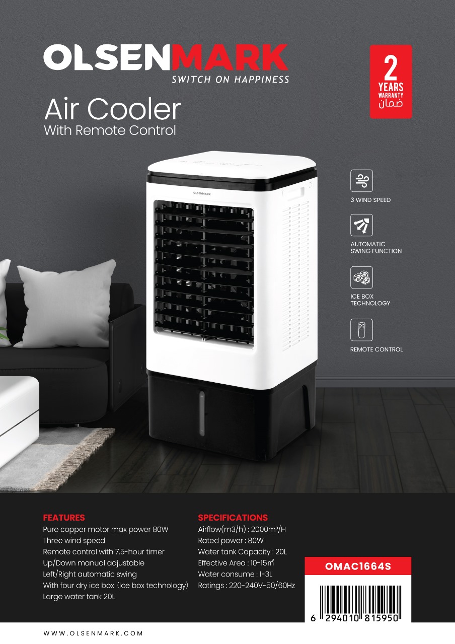 "برده ما يخلص حتى لو الحر مولّع! ❄️🔥 مبرد صحراوي متنقّل.. يبرد لك المكان وين ما تحطه! 🧊🏠🛞" *مميزات المنتج* 1️⃣ تبريد قوي وفعال مزود بتقنية الآيس بوكس و4 علب ثلج، يسحب الهوا الحار ويحوّله لهوا بارد ومنعش خلال ثواني! 2️⃣ سعة مائية كبيرة 20 لتر يعني ما تحتاج تعبي مي كل شوي – مناسب للجلسات الطويلة والمكان الواسع. 3️⃣ ريموت كنترول + 3 سرعات تحكم فـ سرعة المروحة (3 مستويات) وأوضاع التبريد بسهولة عن بعد، مع تحكم تلقائي بالحركة يمين ويسار، ويدوي فوق وتحت. 4️⃣ تصميم سهل الاستخدام وشيّك واجهة بسيطة وسهلة التحكم، مع تصميم أنيق باللون الأبيض يناسب كل الزوايا. 5️⃣ خفيف وسهل النقل بوزن 7.2 كجم بس، تقدر تنقله من غرفة لغرفة بكل سهولة. 6️⃣ ضمان سنتين من الوكيل راحة بالك مضمونة – في حال أي عيب مصنعي، عندك ضمان لمدة سنتين شامل الصيانة من مركز الخدمة المعتمد. *تفاصيل سريعة* السعة: 20 لتر القوة: كهربائية، 220V الأبعاد: الطول: 82 سم العرض: 34 سم الارتفاع: 33.5 سم الوزن: 7.2 كجم اللون: أبيض موديل: OMAC1664 العلامة التجارية: Olsenmark 📌 التعليمات: سهل التركيب والاستخدام – ما يحتاج تجميع تنظيف بقطعة قماش مبللة ضمان يشمل العيوب المصنعية فقط (ما يشمل التركيب الخاطئ أو الإهمال) ❗ ملاحظة مهمة: يتم قبول الاسترجاع خلال 7 أيام فقط إذا المنتج في تغليفه الأصلي وما تم فتحه أو استعماله. 💬 جاهز تبرد بيتك بأقل استهلاك؟ اطلبه الآن وتمتع بهوا بارد ومنعش وين ما كنت! 😎❄️